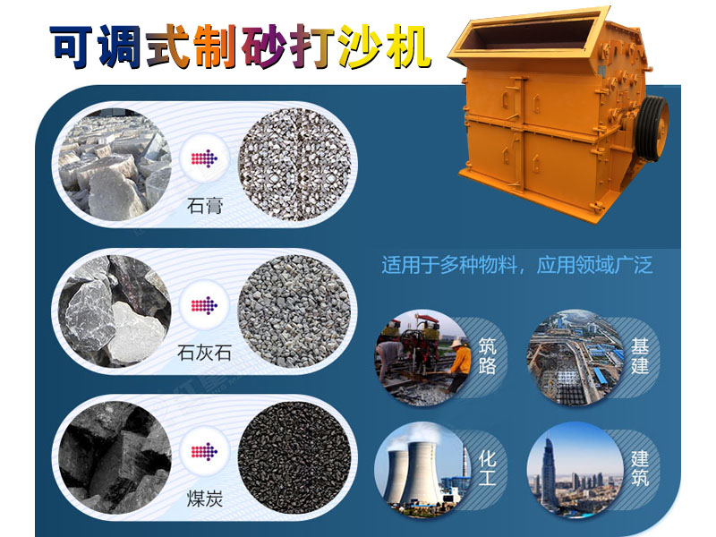 1612可調(diào)式打沙機廣泛應(yīng)用于鐵路建設(shè)、公路建設(shè)、市政建設(shè)、水泥廠、建材業(yè)、陶瓷業(yè)、化工等領(lǐng)域,破碎石灰石、石膏、白堊、煤、明礬等中硬及較軟物料